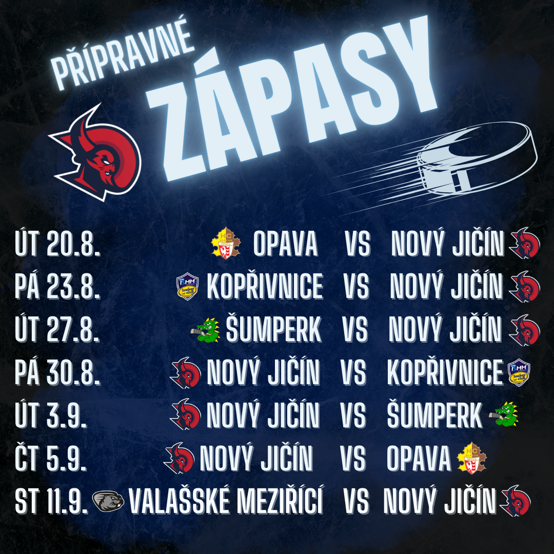 Jako obvykle přijdou před začátkem sezony přípravné zápasy. Novojičínští se v nich utkají s podobnými soupeři jako loni. Sérii přípravných utkání odstartují 20. srpna na ledě Opavy. Během následujících sedmi dnů čeká svěřence Petra Macháčka také duel v nedaleké Kopřivnici a v Šumperku. V domácím prostředí se tak Ďáblové představí až v rámci čtvrtého duelu, kdy přijde čas na odvetu s Kopřivnicí. Během stejného týdne ještě přivítají na novojičínském ledě Draky ze Šumperku a opavský Slezan. Přípravné zápasy pak ukončí 11. září ve Valašském Meziříčí.